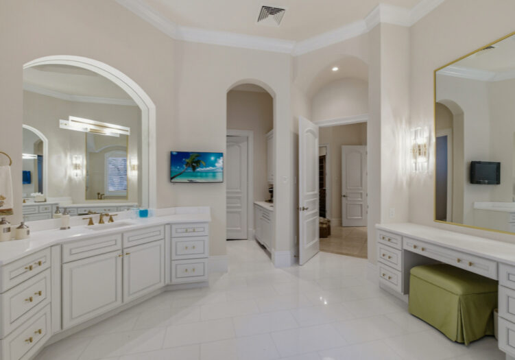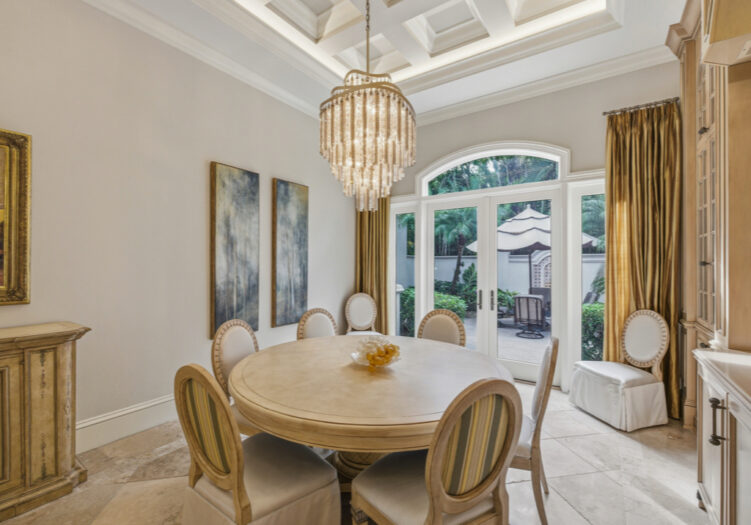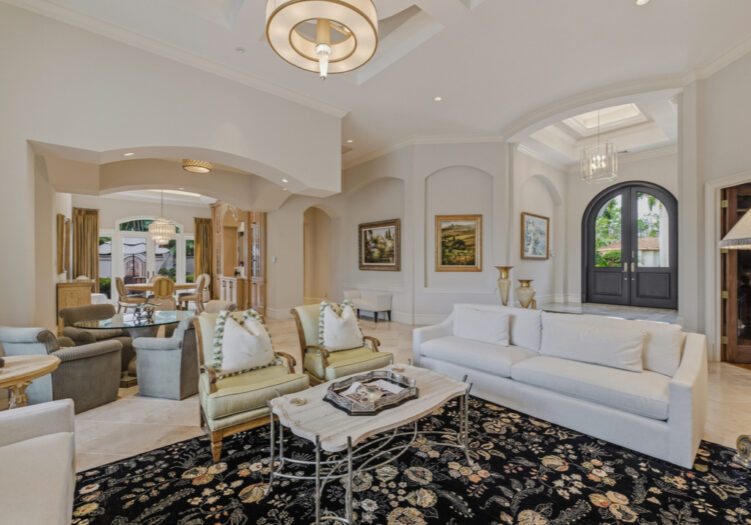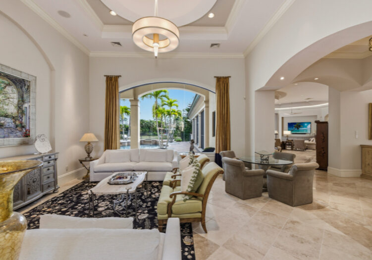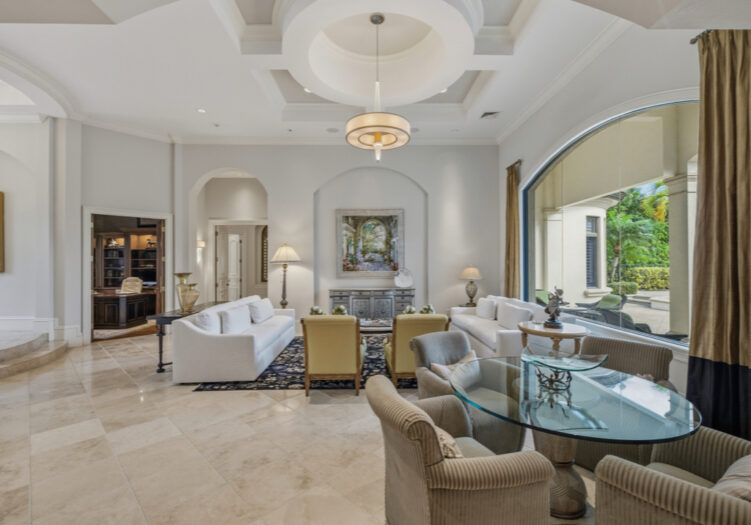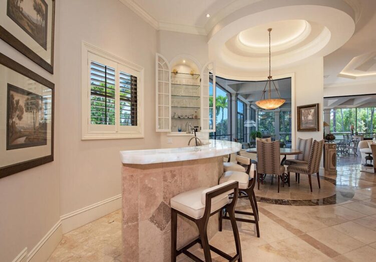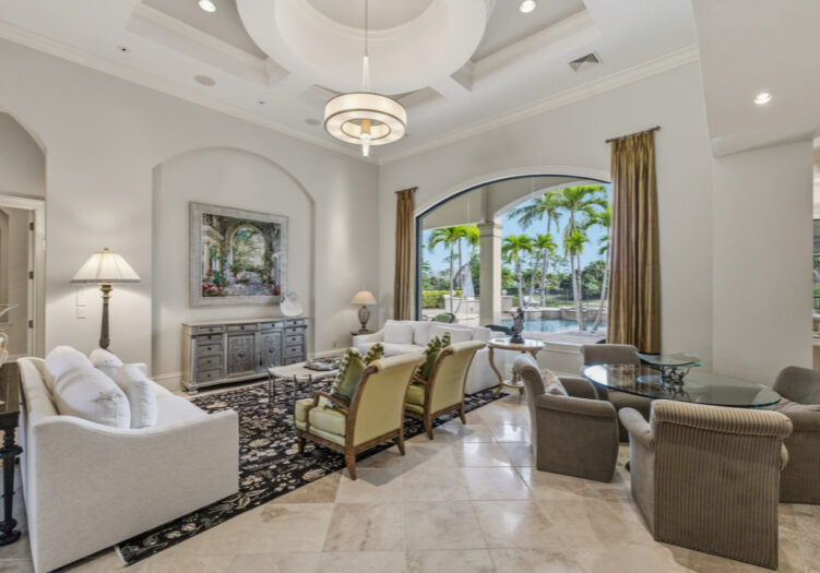 Located in the Mediterra Golf & Beach Club of Naples - GOLF MEMBERSHIP AVAILABLE IMMEDIATELY! Residing in the Teramo neighborhood of Mediterra, this stately single-story McGarvey-built estate offers exceptional curb appeal, showcased by a brick-paver motor court and lush tropical landscaping leading to a raised gallery foyer. The formal living room features dramatic mulled picture windows framing sun-filled views of the shimmering lake and the 6th hole of Mediterra’s North Course. Soaring coffered and tray ceilings, crown moldings, recessed art niches, and neutral travertine stone flooring grace the main living areas throughout. A den/office features wood flooring and custom built-ins, while the formal dining room is enhanced by custom display cabinetry with dual refrigerated wine storage and French doors opening to a private side courtyard. The chef’s kitchen showcases illuminated Cristallo quartzite countertops, abundant white wood cabinetry, an oversized center island with dual Fisher & Paykel dishwashing drawers, Viking 6-burner gas cooktop with hood, Viking double wall ovens and microwave, Sub-Zero refrigeration, KitchenAid refrigerated drawers, a walk-in pantry, extended glass tile backsplash, and a large mulled picture window, complemented by an adjacent wet bar and a breakfast nook ideal for effortless entertaining. The primary suite is a luxurious retreat featuring premium wood flooring, an extended sitting area with bow window wall, two walk-in closets with custom cabinetry, French doors opening to the pool, and a morning coffee bar. The recently renovated spa-inspired primary bath offers quartzite counters, porcelain plank tile flooring, gold hardware finishes, a stand-alone soaking tub, floor-to-ceiling walk-in shower with transom window and multiple showerheads, bidet, his-and-hers water closets, and Murano Venetian mirrors. A recently renovated powder room adds a refined touch for guests. Outdoor living is exceptional, featuring eastern exposure, a covered and screened lanai with travertine flooring, zero-corner sliding doors, a fully equipped summer kitchen with built-in gas grill and sink, dining, seating, and a gas fireplace. The open-air sun deck surrounds the custom pool with integrated fountain and spillover spa, complemented by a covered rear porch and fenced pool deck overlooking tranquil lake and golf views. Additional highlights include a four-car garage, home generator, SONOS sound system, and impact windows with storm shutters. Mediterra is one of Naples’ most prestigious luxury golf & beach club communities, offering 2 Tom Fazio championship golf courses, a private beach club w/ restaurant & bar, tennis, pickleball, bocce, a state-of-the-art fitness center, scenic biking & jogging trails, and dining at the private country club. The Mediterra beach club provides an exclusive Gulf-front escape with a 2-story, 10,000-sq.ft facility featuring indoor & outdoor dining, heated pool, sundeck, and full cabana beach service.